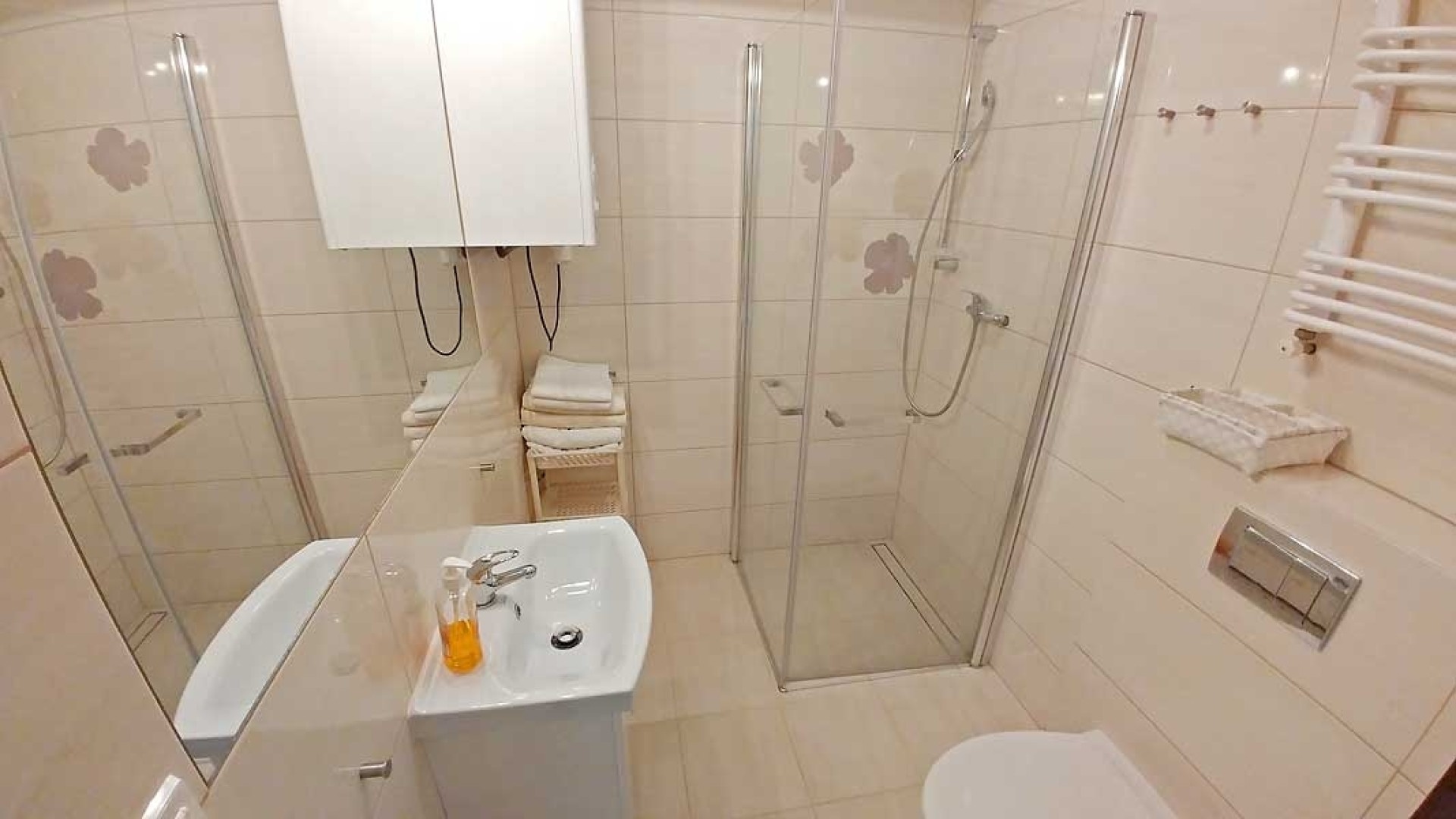 Apartament składa się z: dwóch pokoi, aneksu kuchennego, łazienki, tarasu