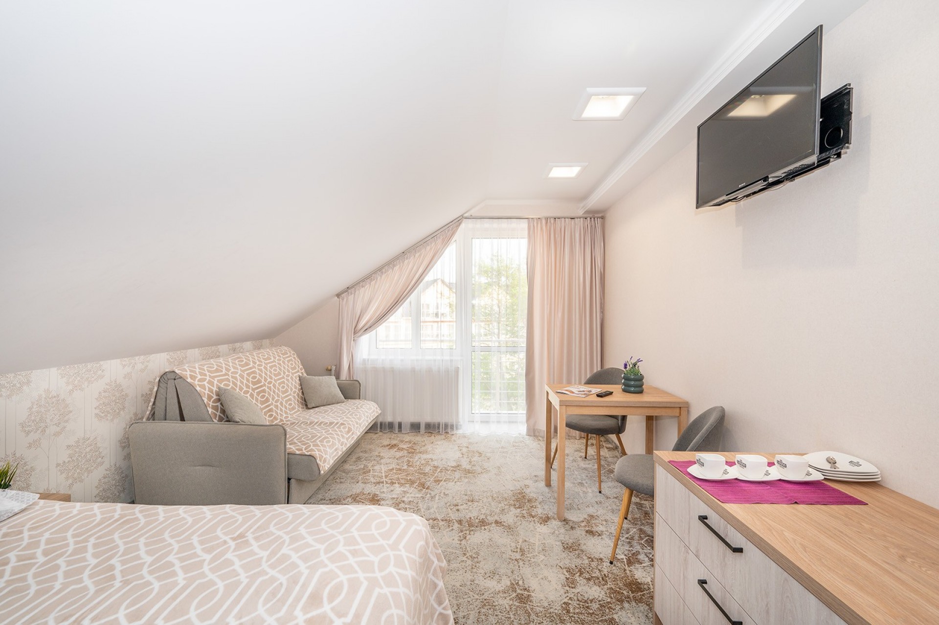 - Pokoje Premium to wygodne, gustownie urządzone pokoje 2 osobowe z możliwością dostawek, mieszczące się w nowej części budynku pensjonatowego. Pokoje wyposażone są w lodówki, telewizory LCD z tv sat. Każdy pokój dysponuje balkonem. Goście mogą korzystać z internetu bezprzewodowego. Sprzęt plażowy dostępny jest w recepcji: leżaki, parawany (nieodpłatnie). Pokoje standard to pokoje 2, 3 i 4 osobowe z azienkami. W ofercie dwa pokoje typu studio. Pokoje wyposażone są w telewizory z tv sat, telefony, czajniki, sztućce, sprzęt plażowy. Większość pokoi z balkonami.
