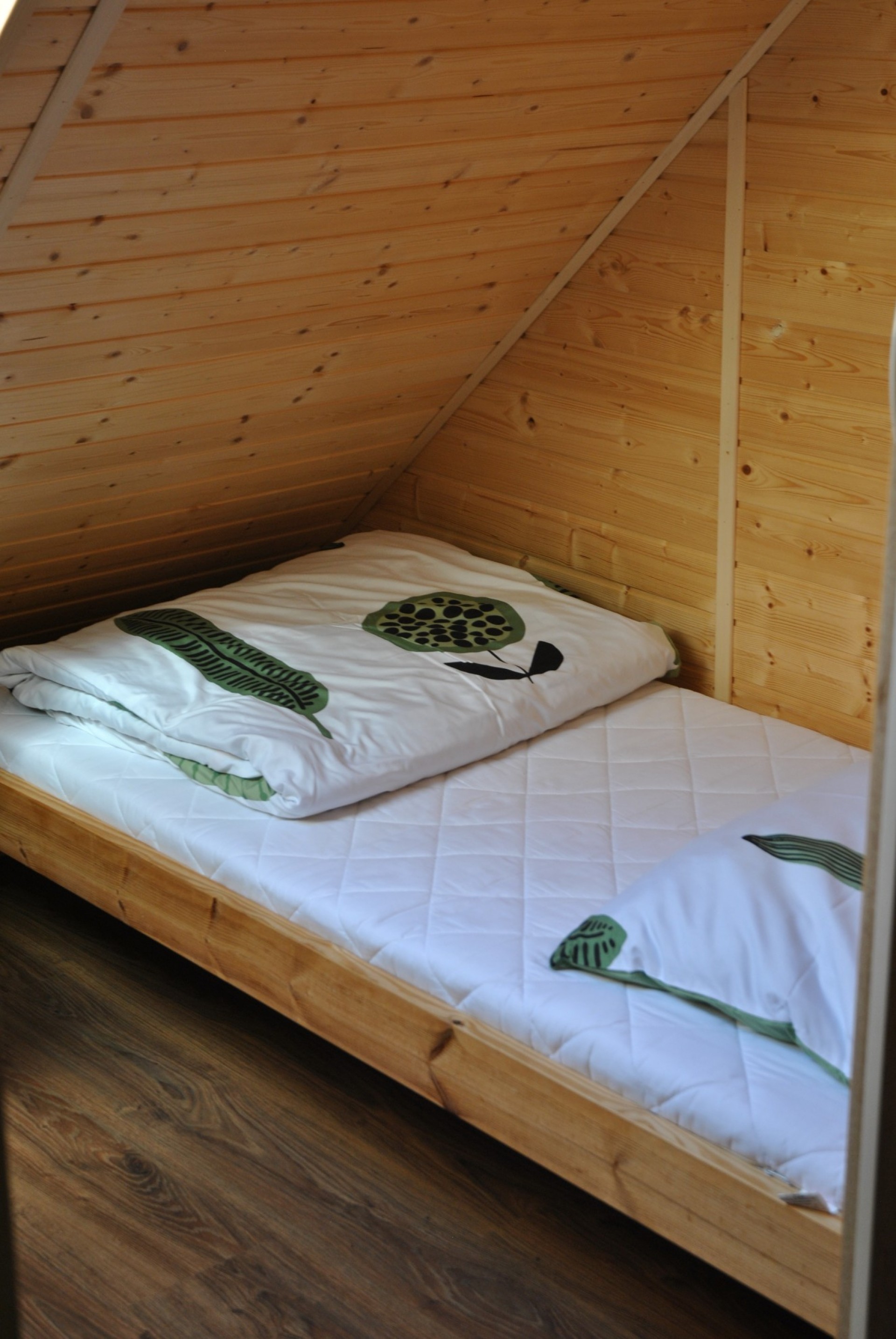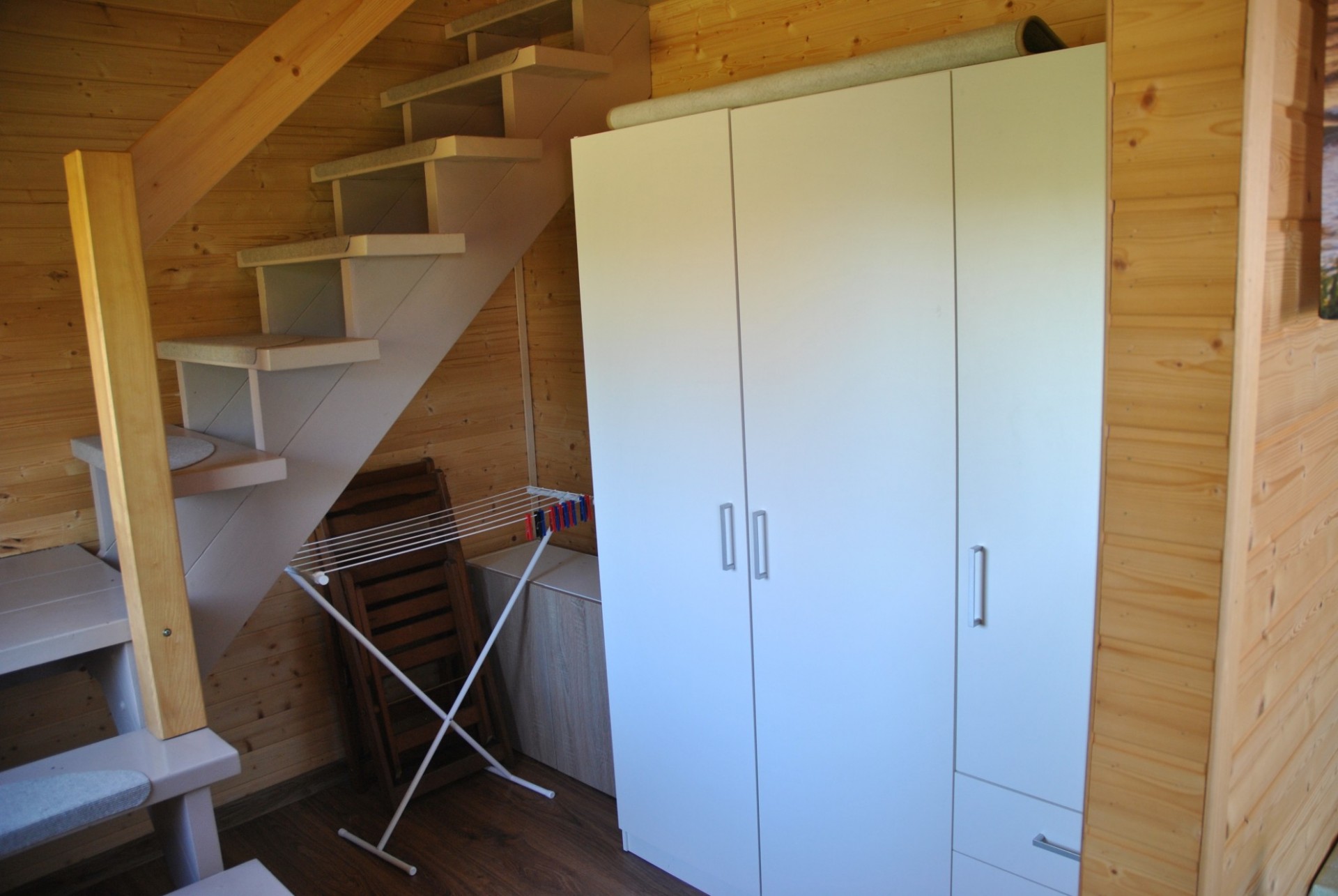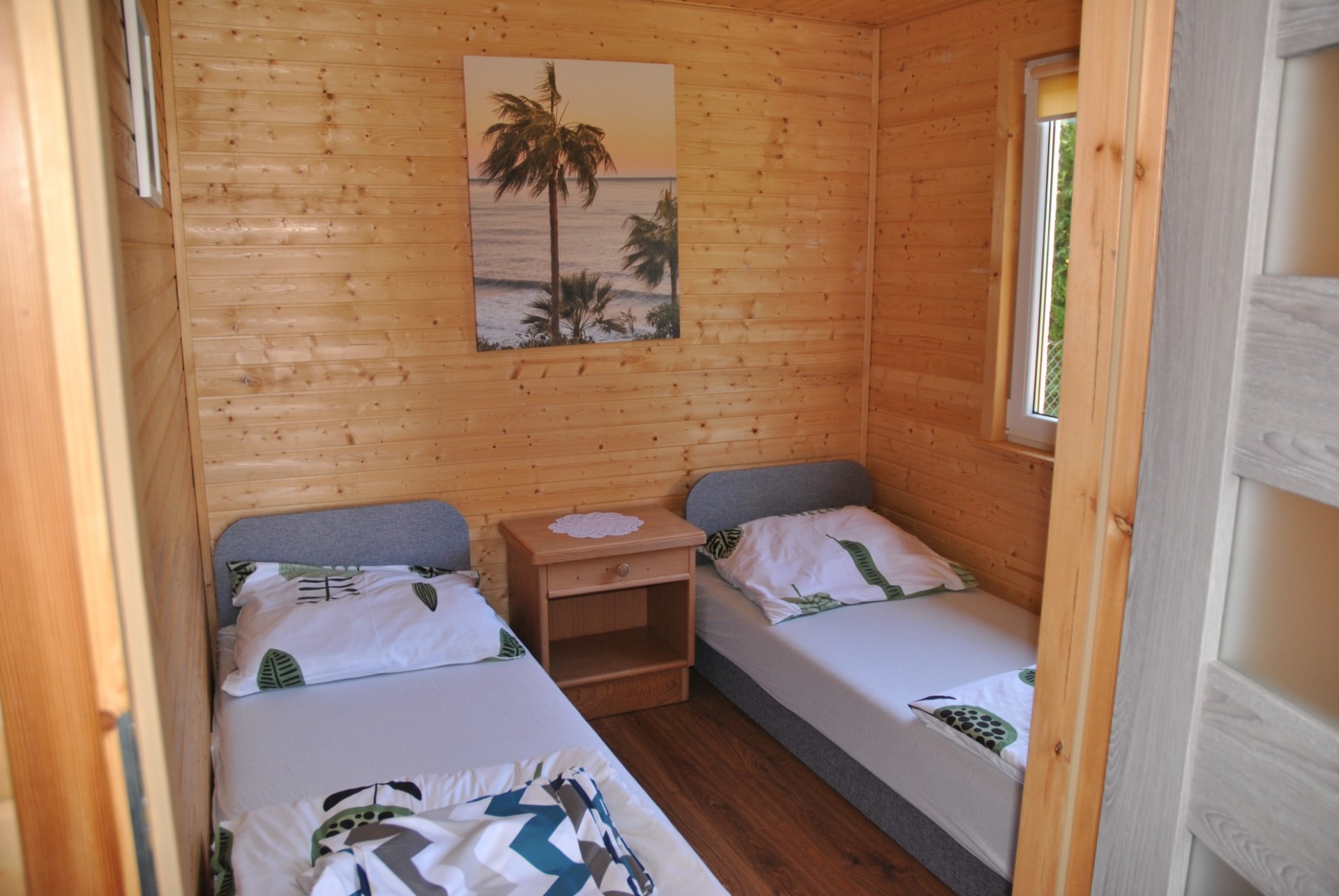 W domku znajduje się sypialnia z dwoma łóżkami i szafą oraz łazienka.