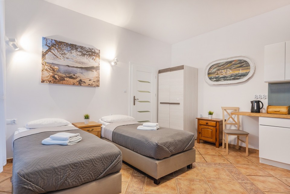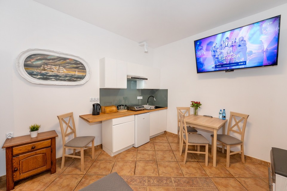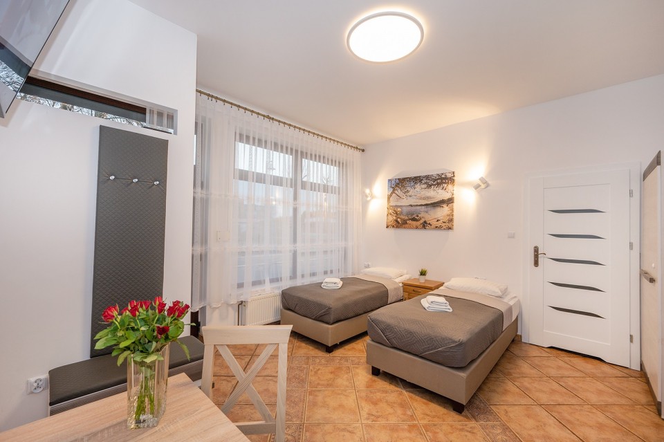 W każdym pokoju: TV, lodówka, łazienka, a w wybranych – własny aneks kuchenny. Gwarantujemy nowoczesne wyposażenie, bezpieczeństwo i przyjazną atmosferę. Nasz obiekt jest ogrzewany i otwarty przez cały rok – zapraszamy również poza sezonem!